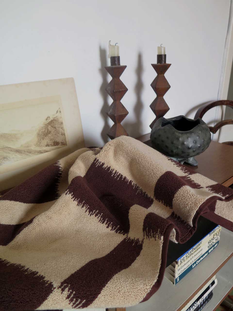 Karin bath towel pattern definitely reminds me of an old blanket at my parents home when I was small. Ester reminds me of hot summers and shadows drawn by the sun. Also both towels are in my favorite colors- brown and dark blue.