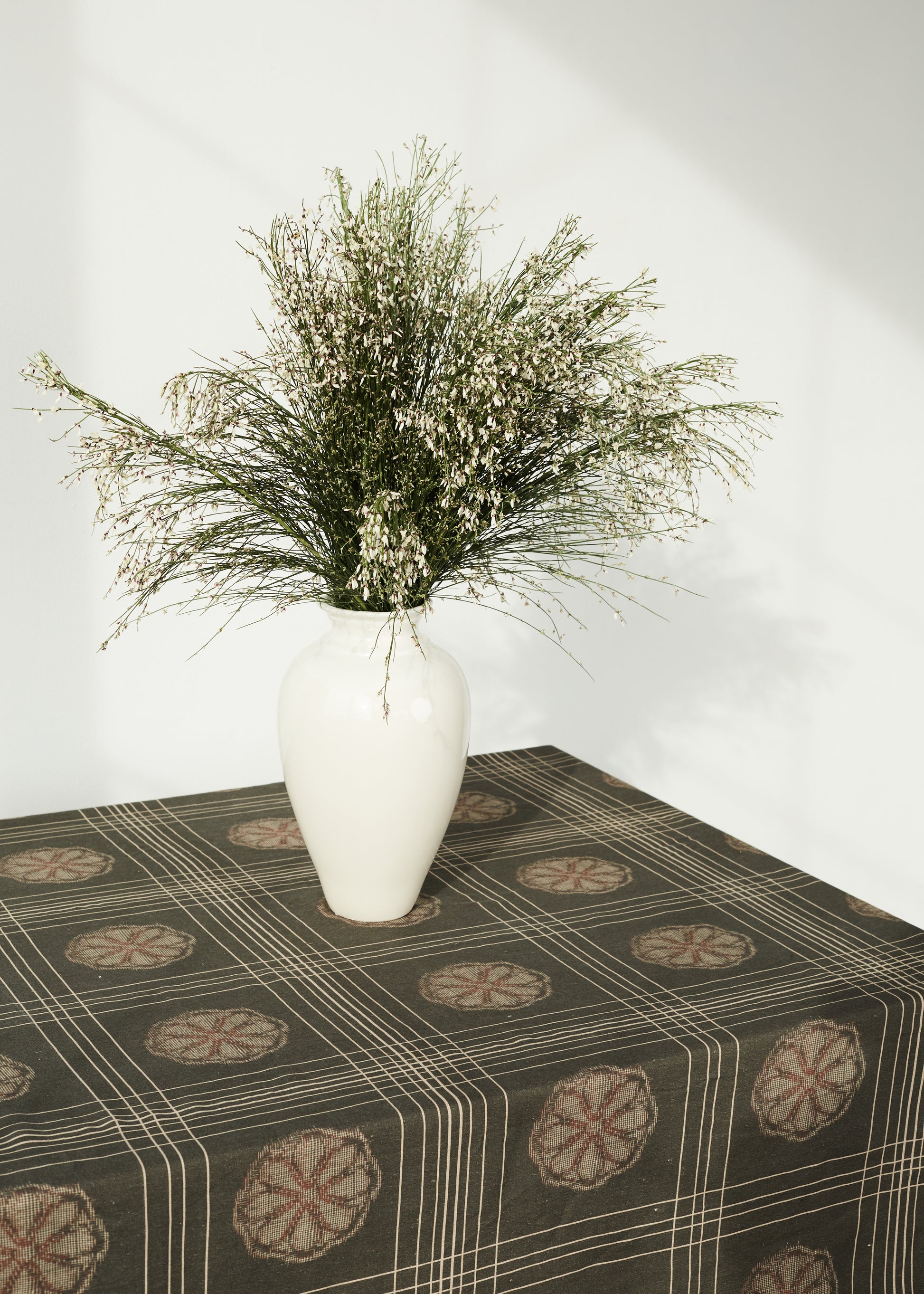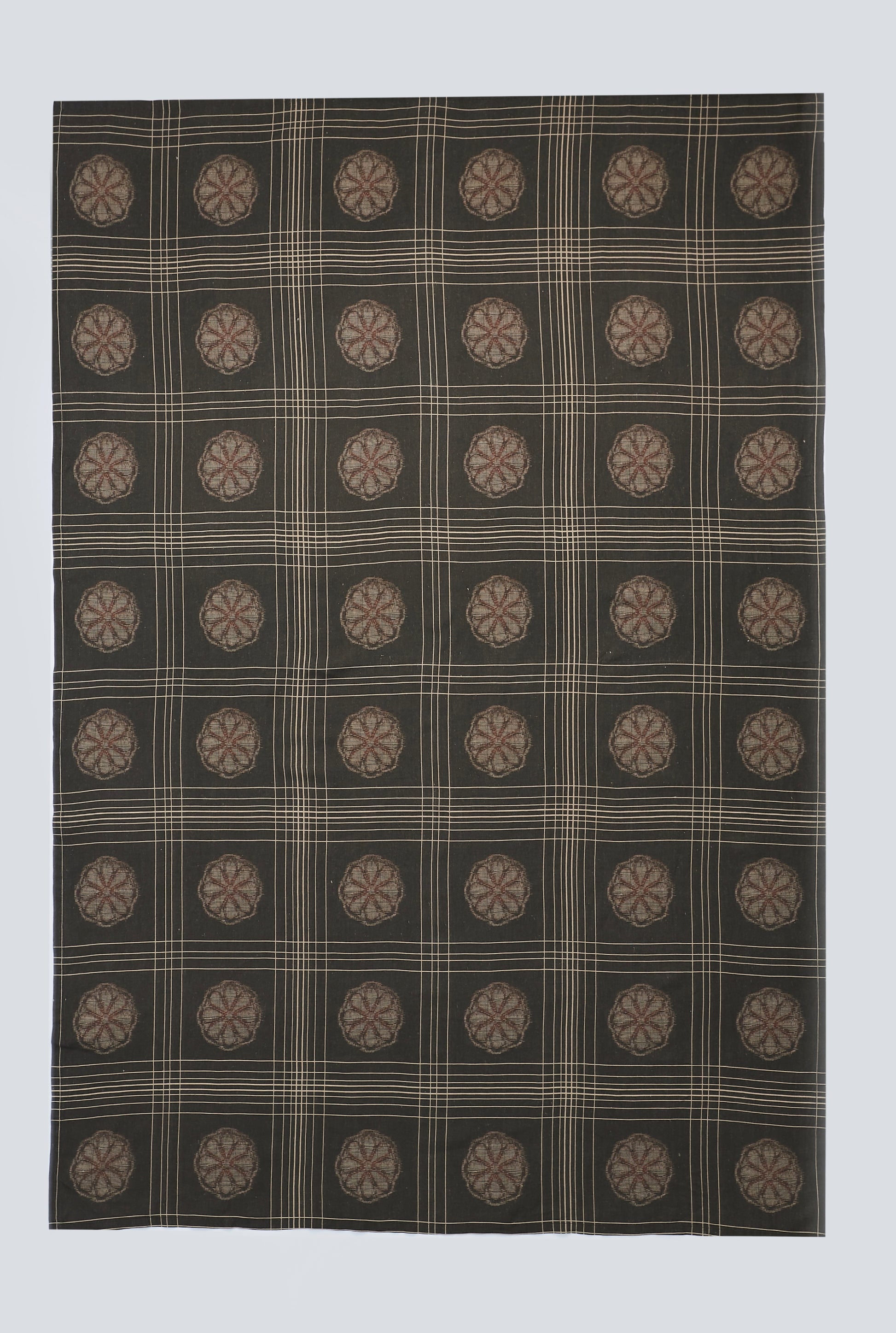 Our most geometric print is inspired by the Japanese tradition of egasuri, or “picture kasuri,” a weaving technique named for its naturalistic motifs — in this case, a repeated floral medallion.